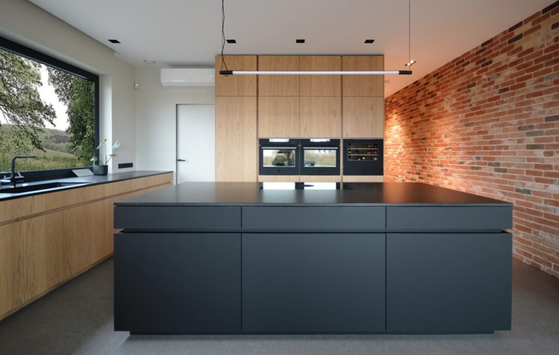 Fronty szafek wykonane zostały z dębowego forniru, natomiast wyspa zyskała kolor głębokiej czerni-eleganckiej i aksamitnej w dotyku.